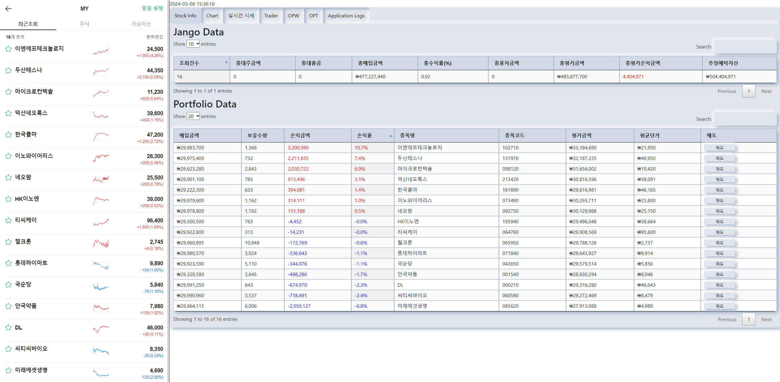 금일 장 마감한 결과는 아래의 이미지와 같이 16 종목을 보유 중이고 이중에 7 종목이 수익, 9 종목이 손실입니다.
