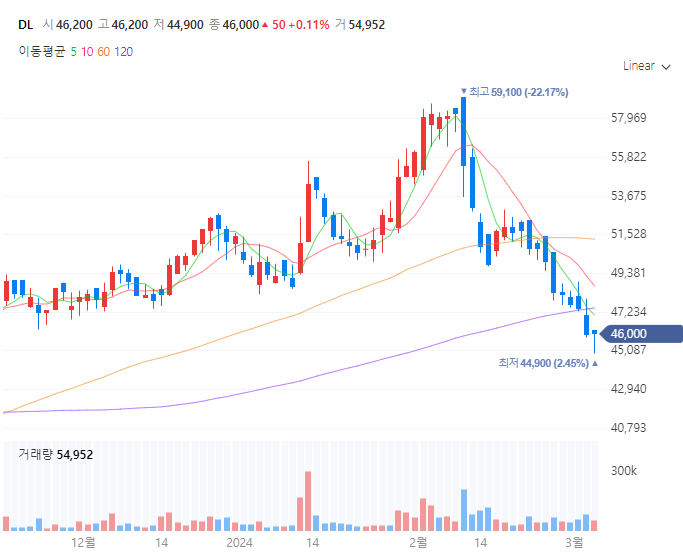 59,100원의 신고가를 달성한 이후로 급락하여 약 한 달 동안 지속적인 하락을 한 종목입니다.