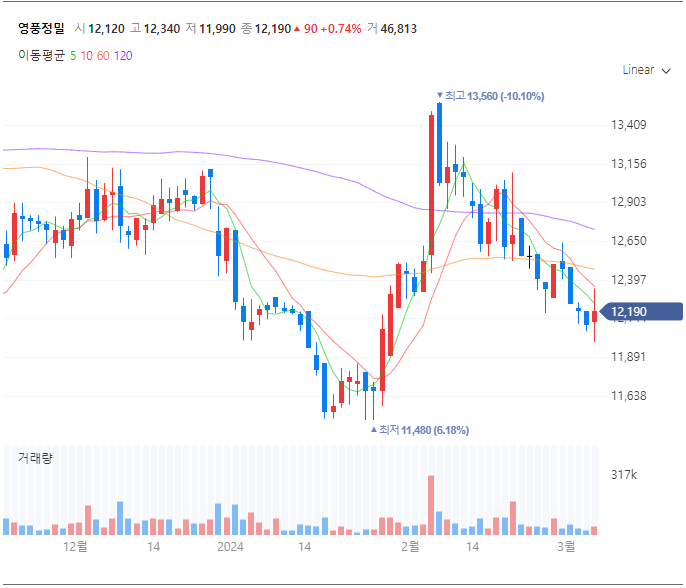 영풍정밀(036560)도 3단 하락 구간이네요 눌림목 매매라서 그런지 조정을 깊게 준 종목만 잡히는데 시장이 강세일 때 눌림목 매매가 좋은지? 시장이 조정일 때 눌림목 매매가 좋은지에 대한 통계는 내 본적이 없습니다만