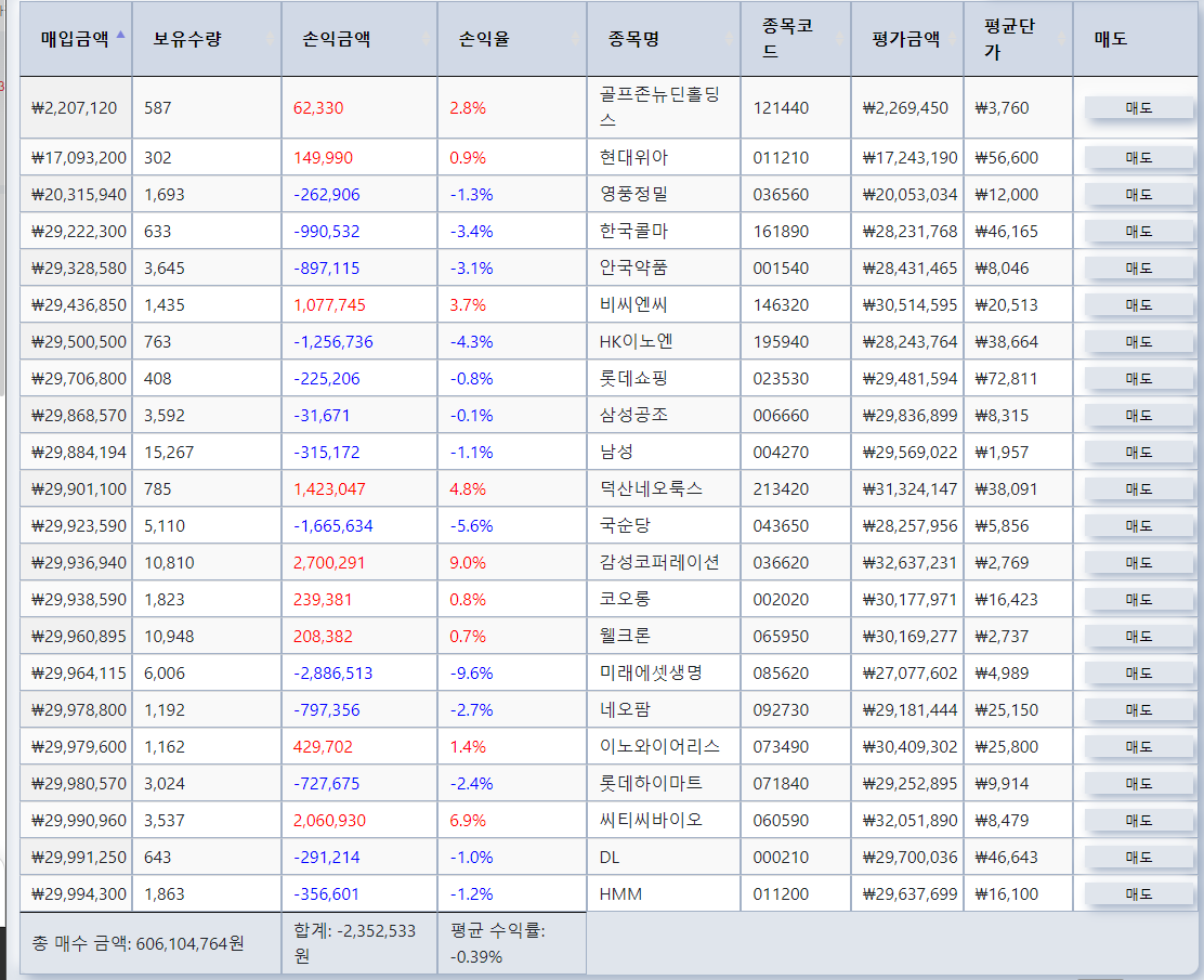 현재 보유 중인 종목들의 수익 금액으로만 보면 -2,352,533원이네요. 수익률로는 -0.39%입니다.