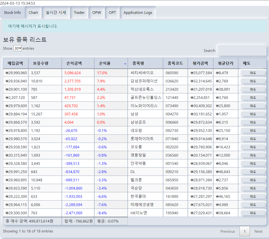 그리고 자동매매 보유 계좌는 현재 18 종목을 보유 중이고 이중에 7 종목이 수익, 11 종목이 손실입니다.