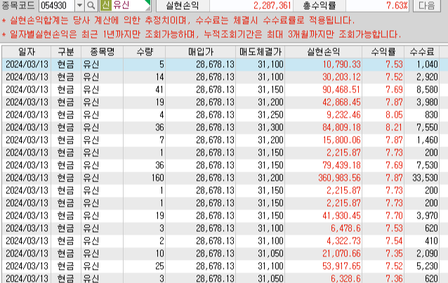 유신 한 종목이 매도 되면서 발생한 오늘의 실현 손익은 +2,287,361원입니다.