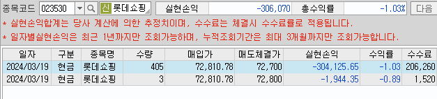 롯데쇼핑(023530)은 바닥권에서 매수가 되었던 종목으로 상승 혹은 하락을 경험하지도 못하고 강제 청산된 종목입니다.