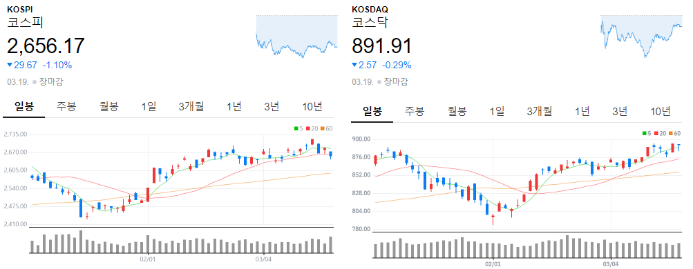 코스피, 코스닥 지수 2024-03-19 화요일