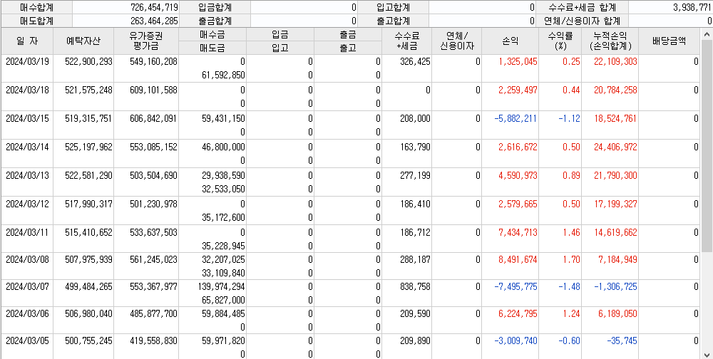 지수의 조정 속에서도 전일보다 수익으로 마감된 이유는 보유 종목 중 DL을 수익으로 매도했기 때문입니다.