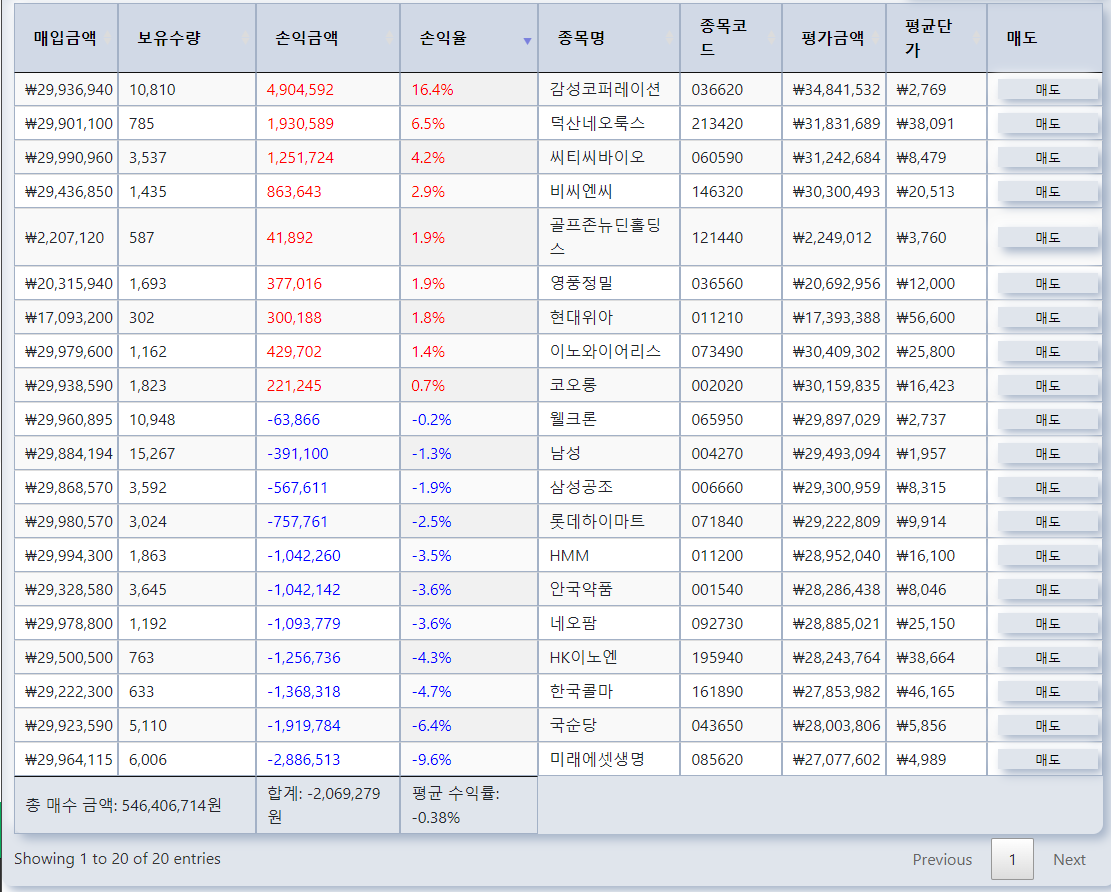 현재 보유 중인 종목들의 수익 금액으로만 보면 -2,069,279원이네요. 수익률로는 -0.38%입니다.