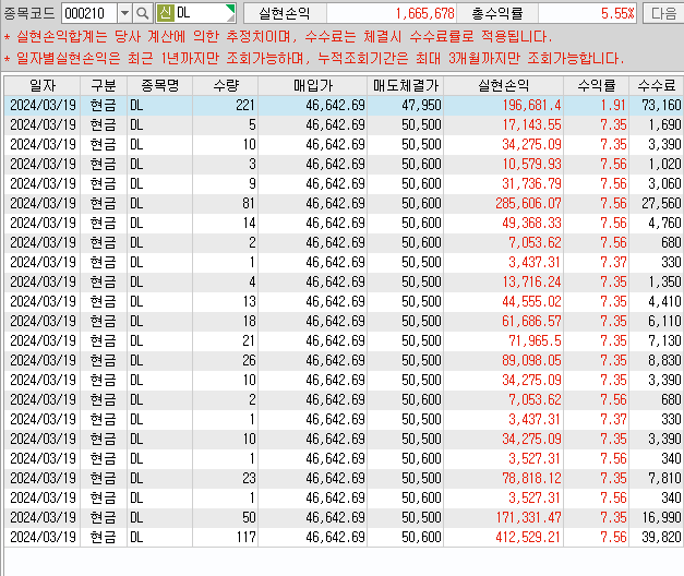 지수의 조정 속에서도 전일보다 수익으로 마감된 이유는 보유 종목 중 DL을 수익으로 매도했기 때문입니다.