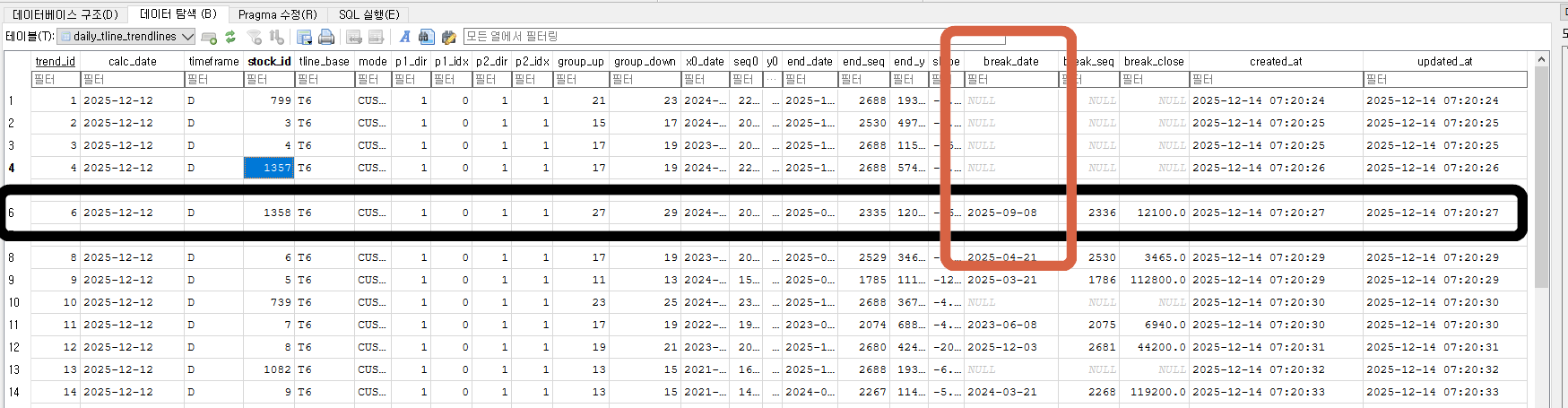 DB에서 종목별 데이터를 읽어와서 하락 추세선 정보를 만들어서 추세선 관련 테이블에 아래와 같이 저장을 했었고요.