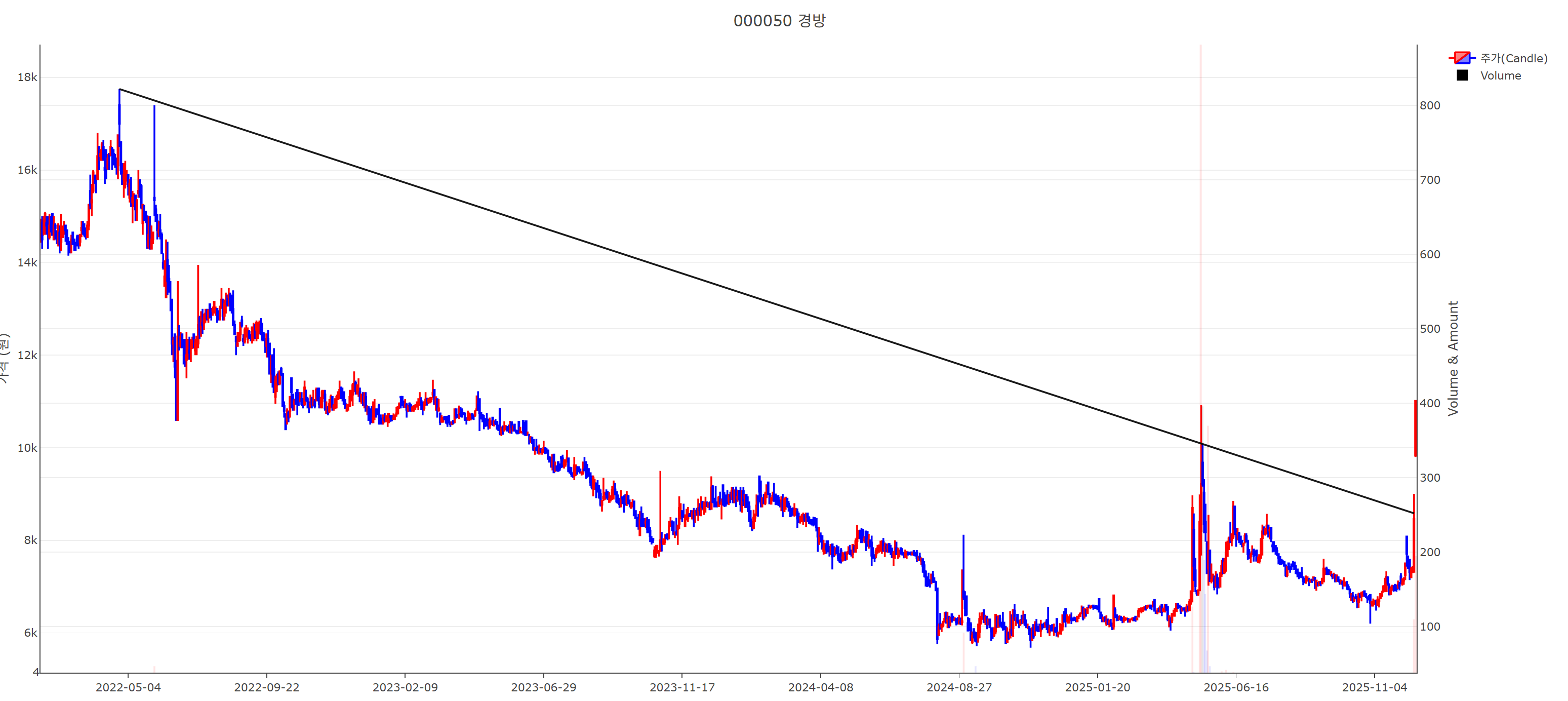 경방 하락 추세선 이탈 차트 확대