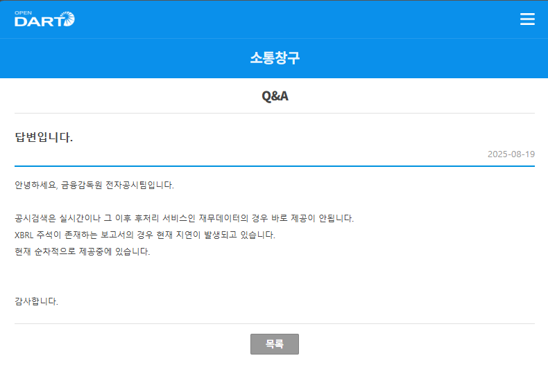 공식적인 답변은 실시간 데이터로도 제공이 되지만 재무데이터의 경우 후처리 성격이 강하기 때문에 바로 제공이 안 된다는 문제도 있었습니다.