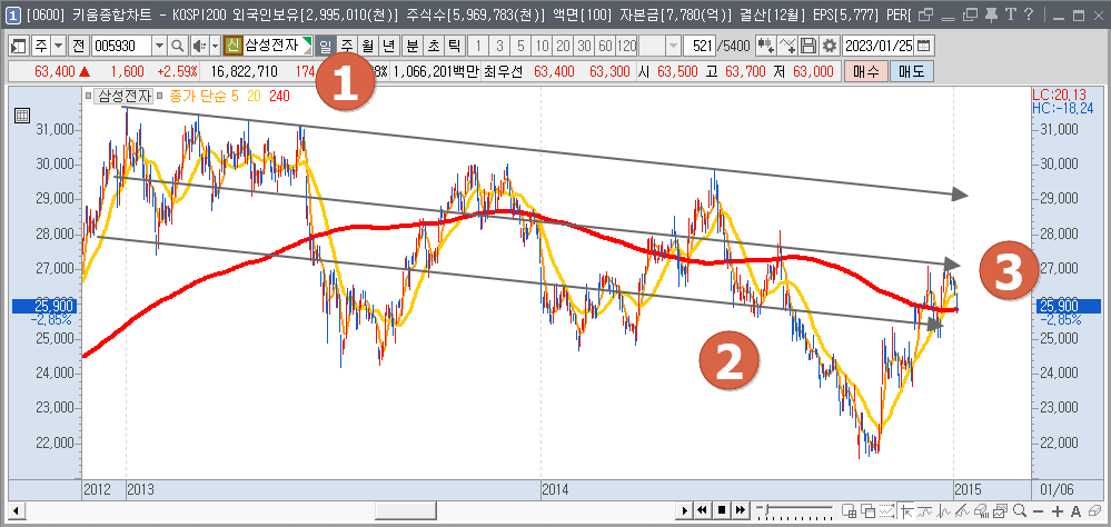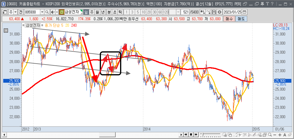 - 우선 장기 이평선이 2013년을 기점으로 240일 이평선이 우하향 하고 있으므로 저항 추세선을 먼저 만들고