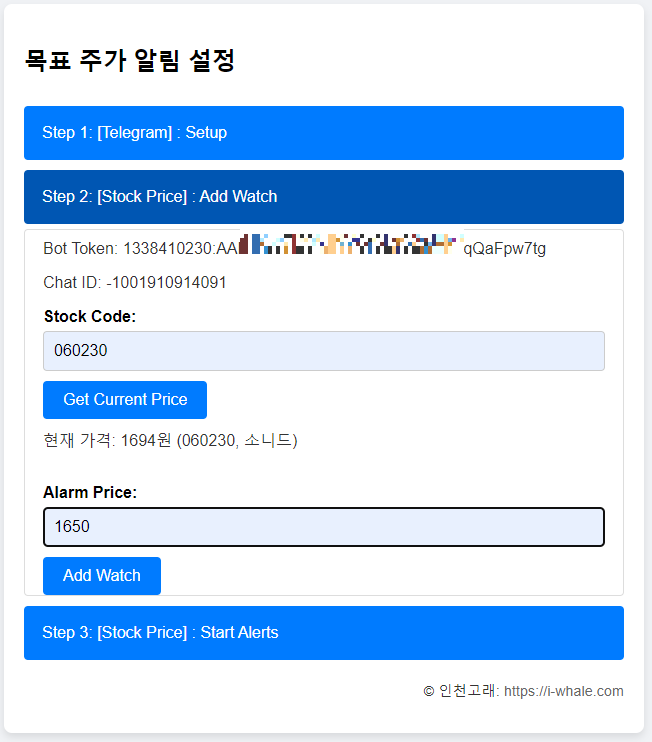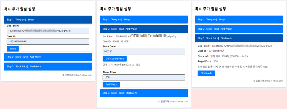 설정한 값을 다시 한번 체크하신 후에 알림 버튼("Start Alerts")을 클릭하면 플라스크(파이썬 코드)에서 관련 명령이 실행이 되며 조건이 맞을 경우 텔레그램으로 메시지를 전송하게 됩니다. (이 글의 맨 위의 텔레그램 메시지 이미지 참조)