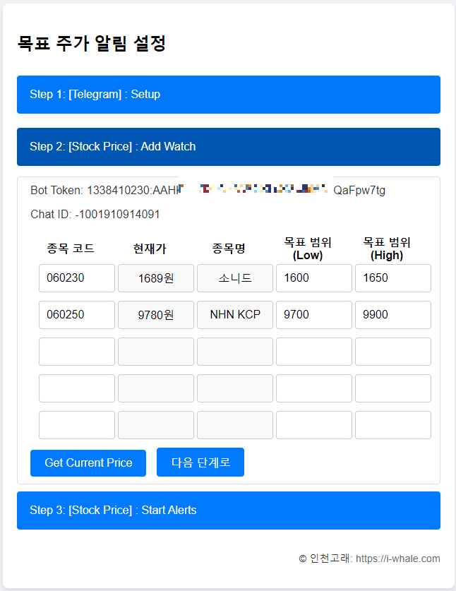 1단계를 완성한 경우 2단계 화면이 자동적으로 오픈이 되면서 1단계의 값(Bot Token, Chat D)이 출력되며