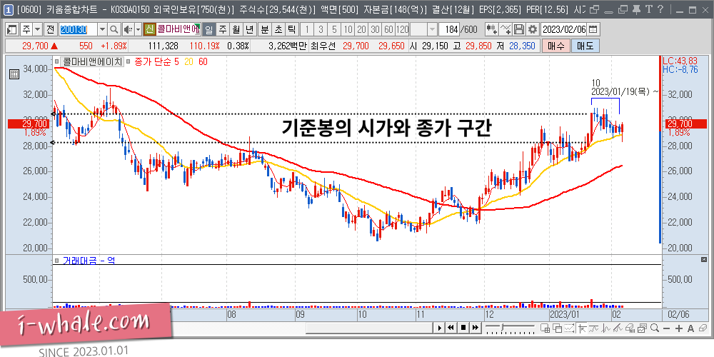 그럼 콜마비앤에이치의 차트를 보면서 최근에 발생한 기준봉이 이전의 주가 영향을 받고 있는지 확인을 해 보겠습니다.