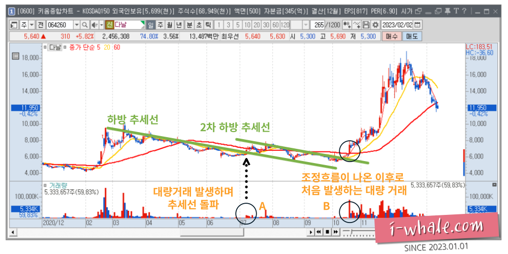 여기에서 중요한 포인트는 하락 추세에서 전환 추세로 전환하기 위해서는 대량의 거래량 + 추세선 위에서 종가가 마감이 되어야 한다는 점입니다.