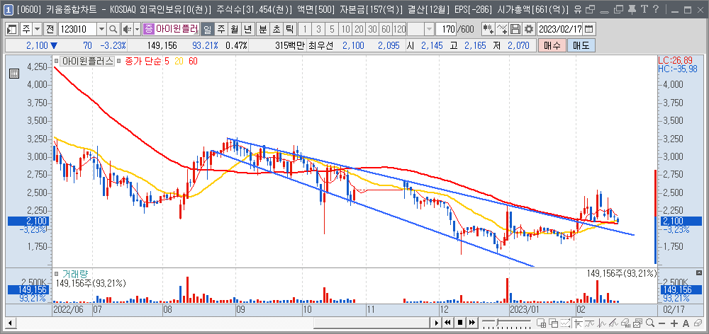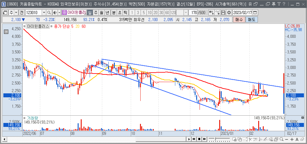 그럼 아이윈플러스는 단타 대상만 될 뿐 큰 수익을 얻을 수 있는 스윙투자 관점은 안 된다는 이야기가 됩니다. (회사의 재무제표 안정성이나 성장성은 배제하고 기술적 분석 내용으로만 말씀드린 것입니다.)