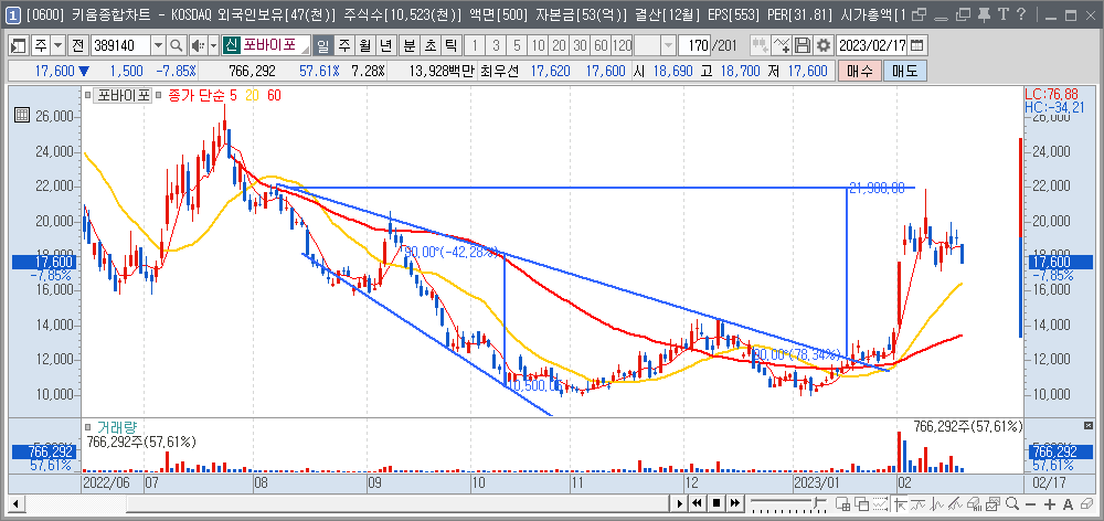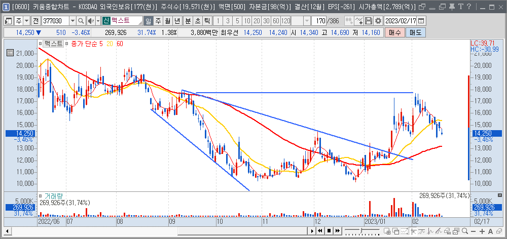 상향 돌파한 시점을 보면 2023년 01월에 대량 거래가 발생하며 상단 추세선을 돌파하였고 이후 하락 확대 쐐기형 패턴의 고점까지 상승을 한 케이스입니다.