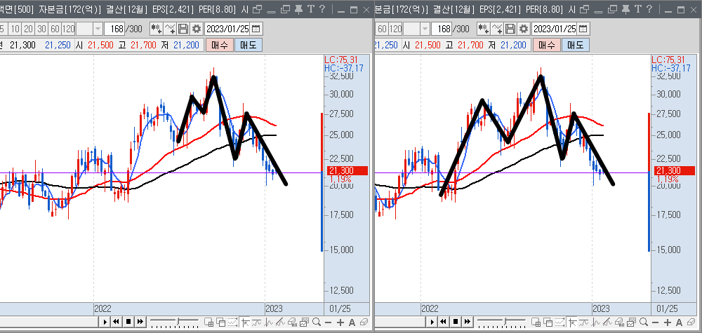 차트를 이해하는 방법이 서로 다를 수 있기 때문에 아래에 2가지 방식으로 선을 그려 보았습니다.