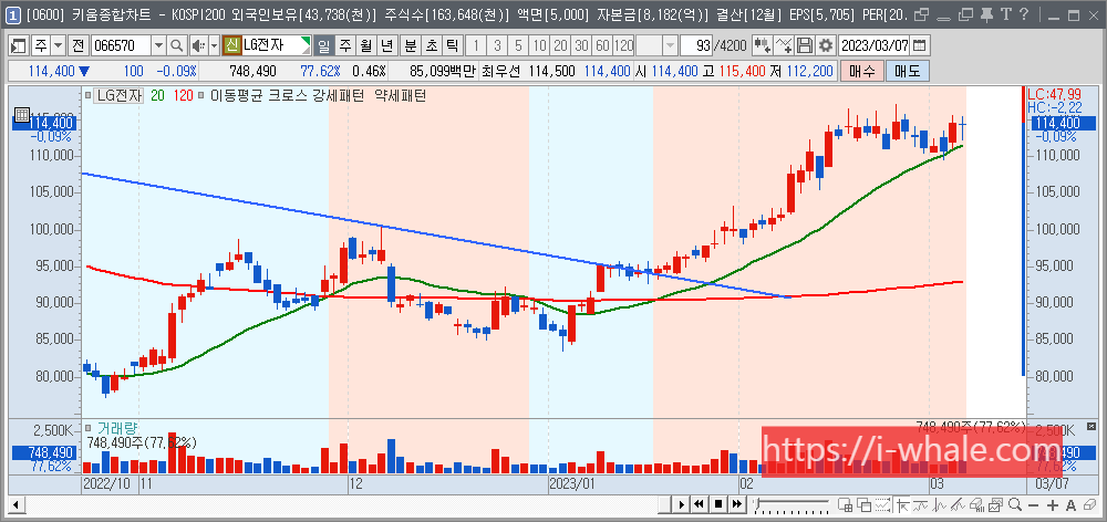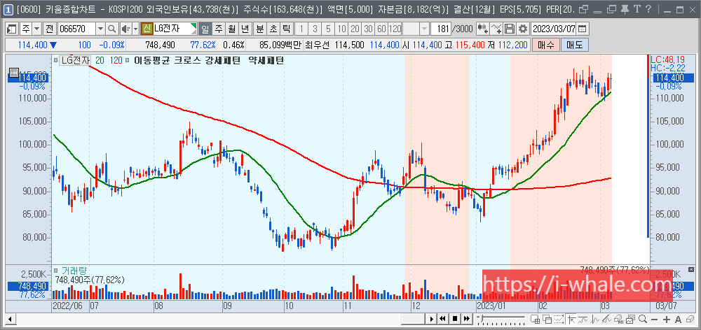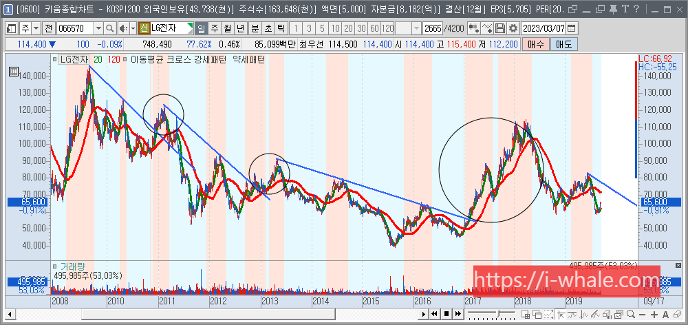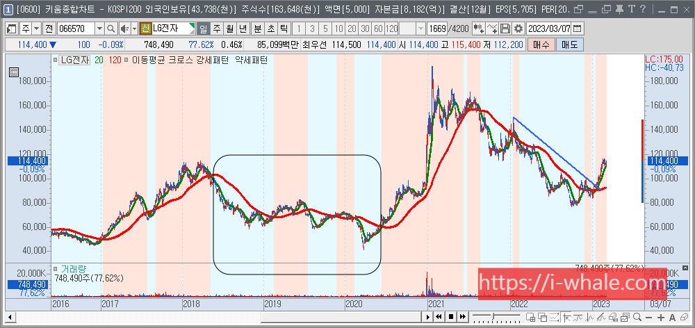 2021년부터 2023년까지의 LG전자 차트입니다. 빨간 선이 120일선입니다.