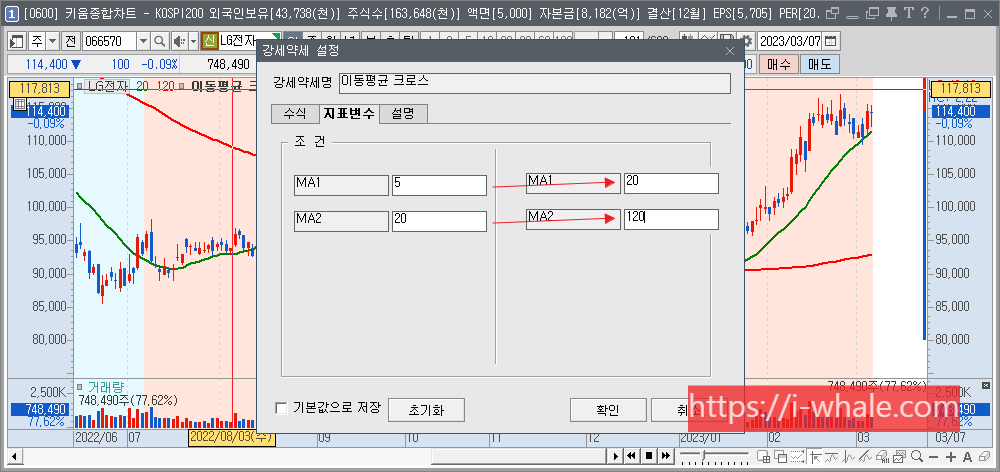 이동평균 크로스 강세약세의 이동평균선값을 단기와 장기로 변경