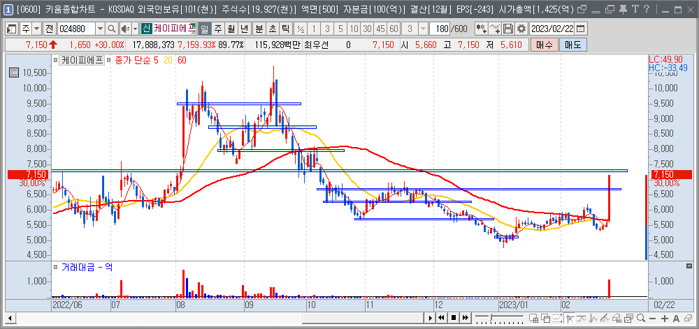 상한가가 발생된 케이피에프를 저도 보유하고 있었기 때문에 매매일지를 하나 올려 봅니다.