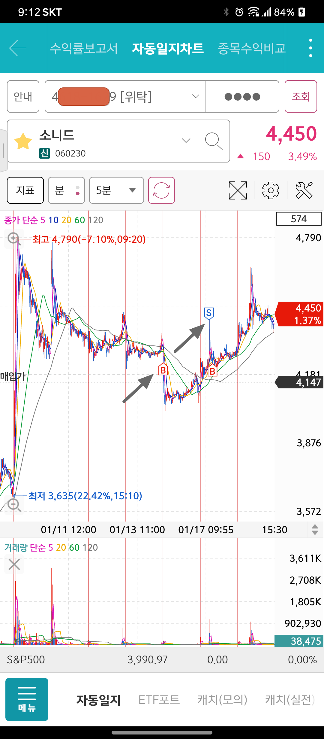 위의 5분 봉 차트를 보면 어제(1/17) 오전에 4,200원 부근에서 매수를 했었는데