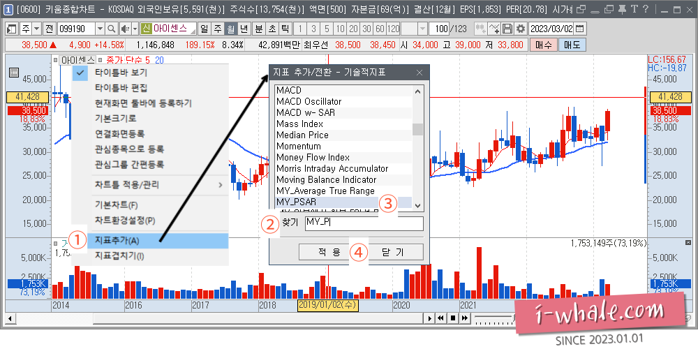 이전에 차트에 추가했던 MY_PSAR을 삭제해 주신 후에 새로이 "지표추가"를 해서 위에서 변경한 "MY_PSAR"을 추가해 줍니다.