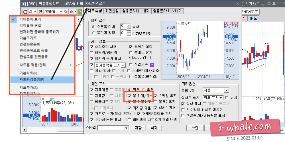 "봉 최대/최소"를 v체크를 하고 난 뒤 확인 버튼을 누르면 아래와 같이 차트가 나와야 합니다.
