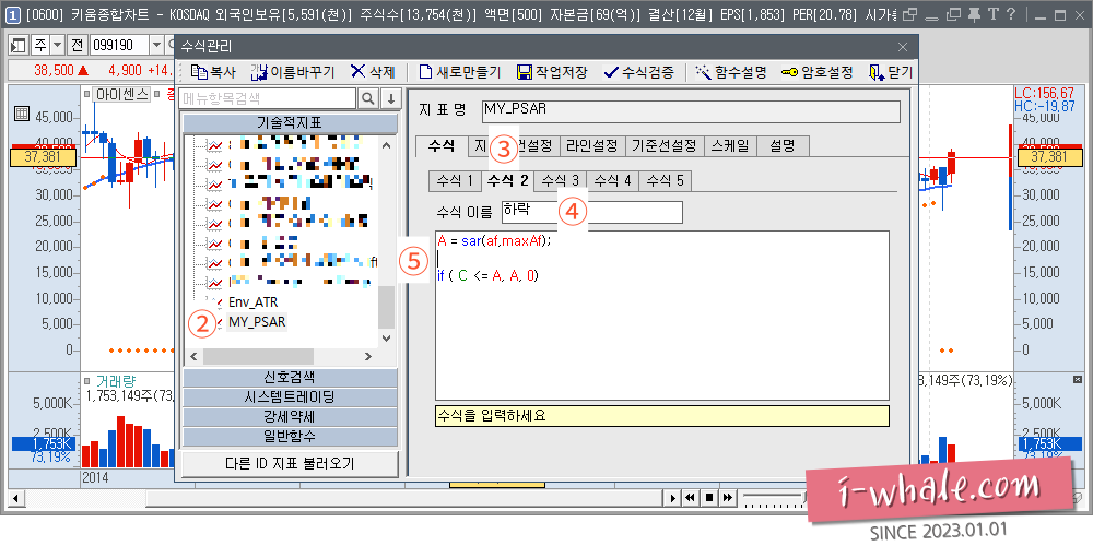 그럼 이제는 만들어진 "MY_PSAR" 지표의 수식을 변경해서 원하는 대로 변경을 해 보도록 하겠습니다.