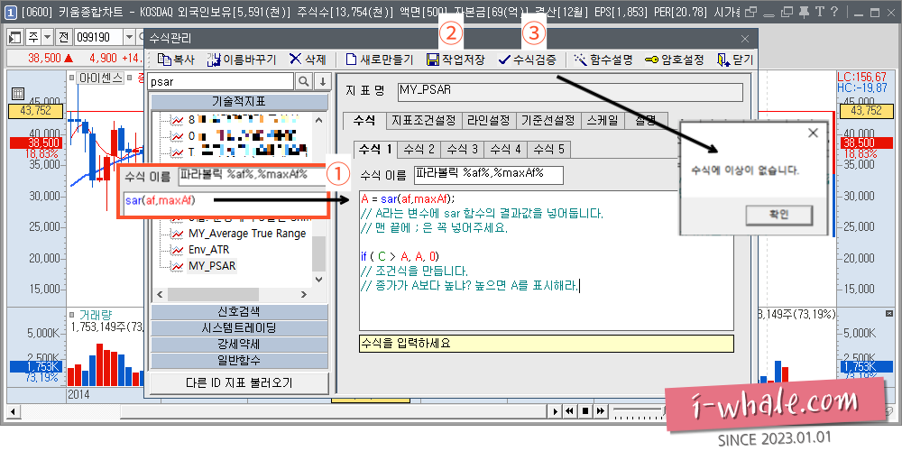 // 위 내용에 대한 코드 설명은 잠시 후에 진행해 드리도록 하겠습니다. - "작업저장" 버튼을 클릭해서 MY_PSAR 지표를 저장합니다.