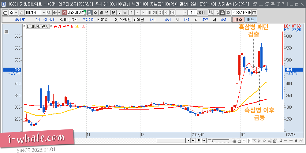 아래의 화살표 구간을 보면 상한가 이후 2월 8일에 흑삼병 패턴이 발생되었고 2일의 시간이 지난 후 급등하면서 장대양봉을 만들었습니다.
