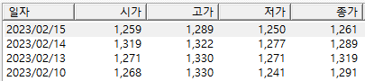 3일간(13일~15일)의 주가 흐름을 보면 최저가는 1,250원으로 상승예상하던 날의 종가(1,291원)보다 41원 빠진 최저가이며 최고가는 1,330원으로 상승 예상하던 날의 종가보다 39원 상승하였습니다.