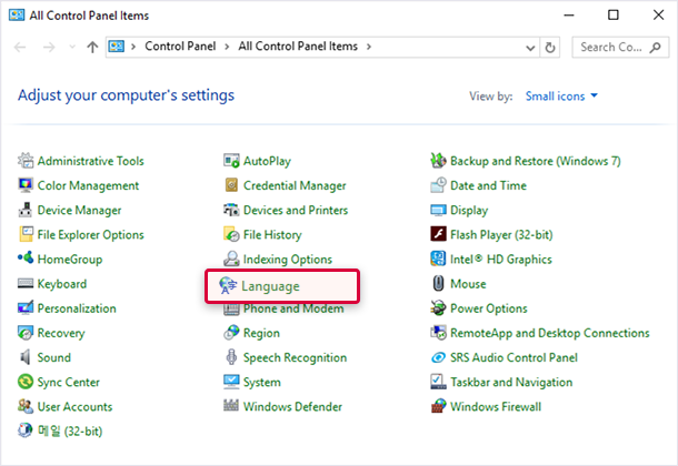 ‘Korea’ 선택 - 4.All Control Panel Items(제어판) > Language(언어)