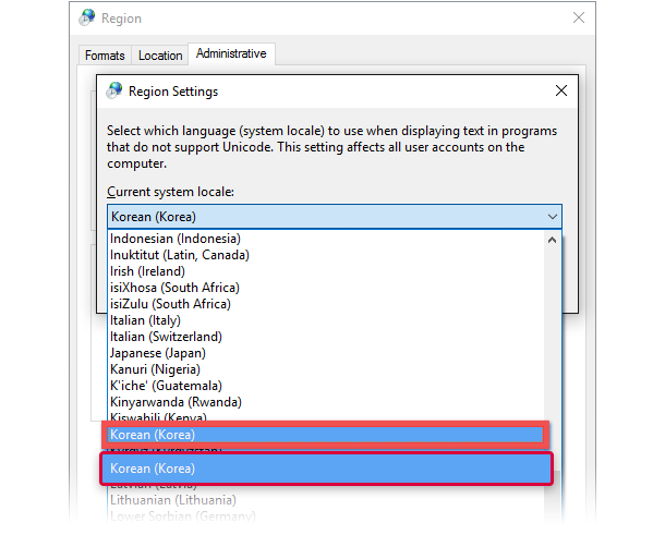 ‘intl.cpl’ 입력 후 엔터 - 2.Region > ‘Administrative’ tab > ‘Change system locale’ 클릭