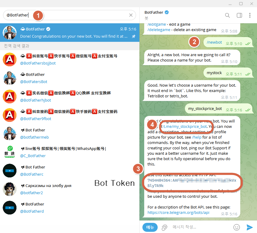 텔레그램 봇을 생성하기 위해서는 약 4단계를 거쳐야 합니다. 어렵지 않으니 천천히 따라 해 보시면 됩니다.