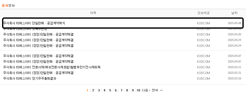위의 네이버 증권의 티에스아이 공시 리스트를 들어가 보시면 아래와 같이 5월 8일자로 공급계약해지가 발생된 공시를 확인하실 수 있습니다.