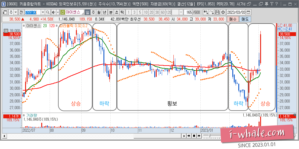 전고점 돌파등 흐름이 없는 관계로 주가 상승률은 미비(20일선의 이평선 각도가 약함, 이격도가 약함)한 상황입니다.