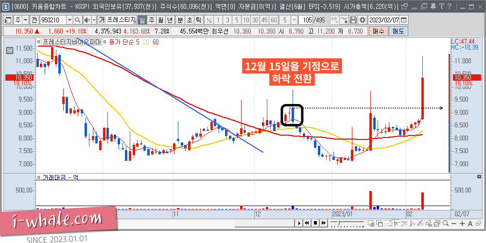 프레스티지바이오파마는 전환추세로 전환된 상태이며 오늘 캔들이 상승추세로 전환하는 시점이 되는 지점이라 생각이 듭니다.