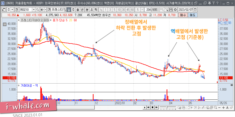 일단 60일선 밑에서 주가가 5개월 이상 움직이면 역배열입니다.