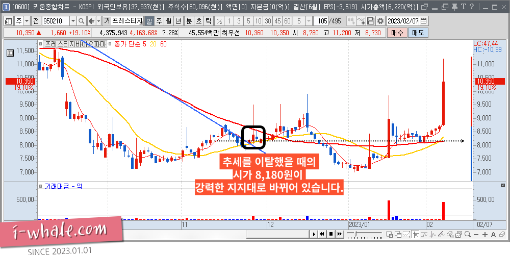 프레스티지바이오파마는 전환추세로 전환된 상태이며 오늘 캔들이 상승추세로 전환하는 시점이 되는 지점이라 생각이 듭니다.