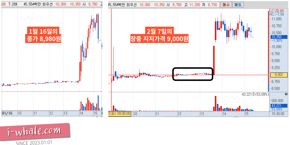 오른쪽 차트에서 사각형으로 마크한 곳의 주가를 보시면 9,000원 위에서 견조한 흐름을 보여주고 있습니다.