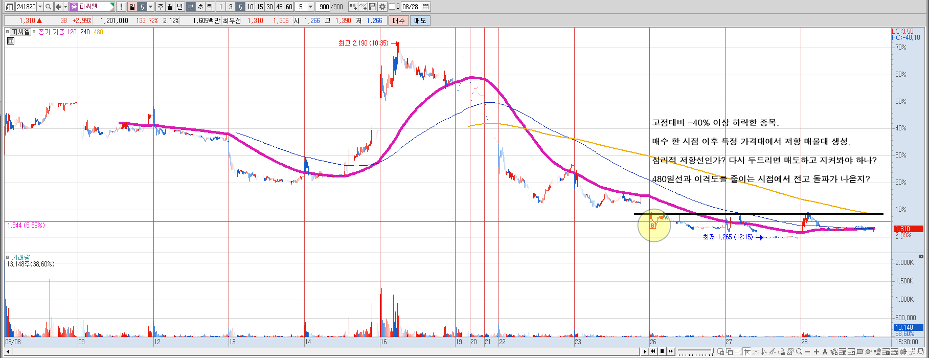2. 매수 한 시점 이후 특정 가격대에서 저항 매물대 생성.