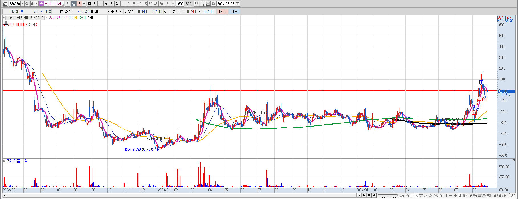 아래는 프레스티지바이오로직스 일봉과 주봉.