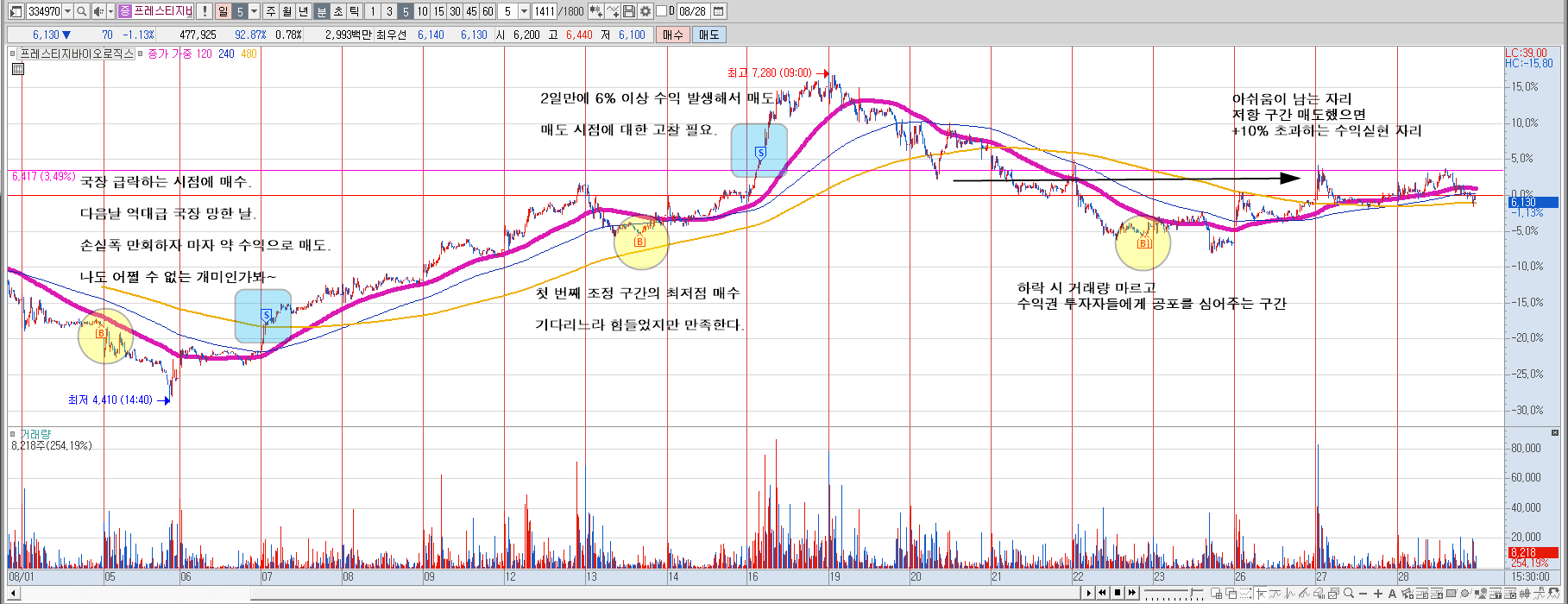 2. 매수 한 시점 대비 6%정도의 수익을 기대하였지만 3~4% 수익 발생하여 매도 안함.