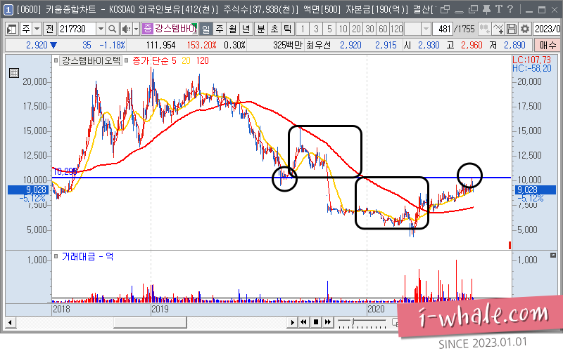 강스템바이오텍은 2018년도의 전고점을 돌파하며 2018년도 연말과 2019년도 초에 상당한 기대감을 줬던 종목입니다.