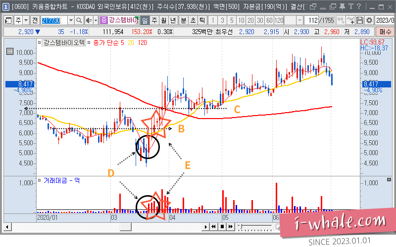 즉, C구간은 3월 초의 500억 기준봉의 상단이 지지라인 역할을 하고 추가로