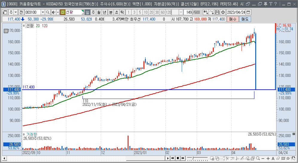약 110일 전의 주가로 회귀를 한 상태이지만 특이할만한 점은 거래량이 전일 대비 53%에 불과하다는 것이고