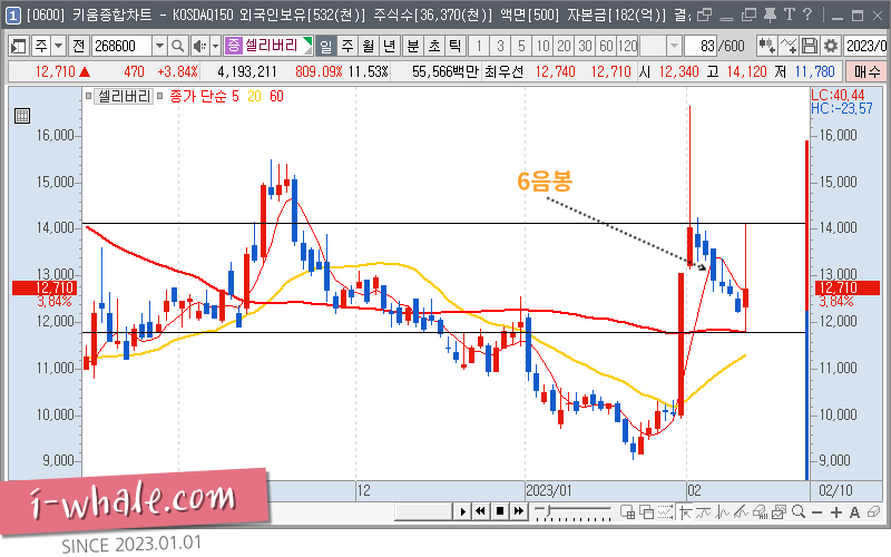 상한가 이후 긴 윗꼬리 양봉을 만든 후 6 음봉까지 만든 뒤 2월 10일 윗꼬리가 긴 양봉을 만들었습니다.