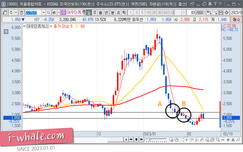 2023년 2월 8일(수)의 주가는 8,350원 부근에서 지지를 받으며 양봉을 만들었음을 확인할 수 있습니다.