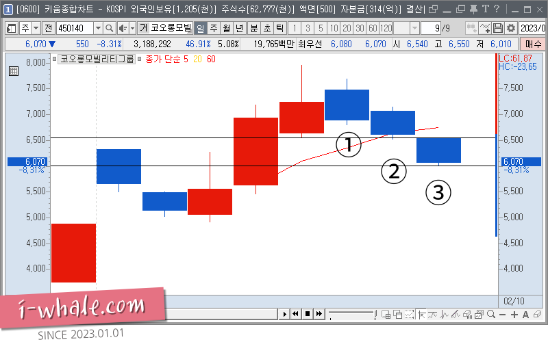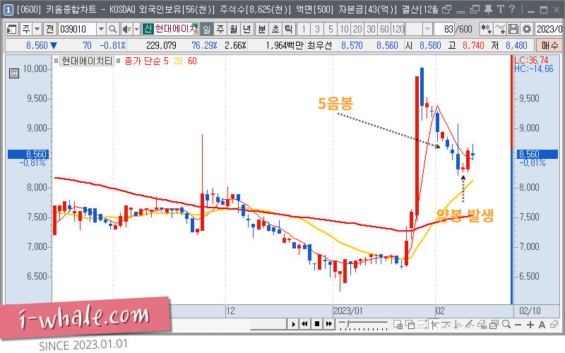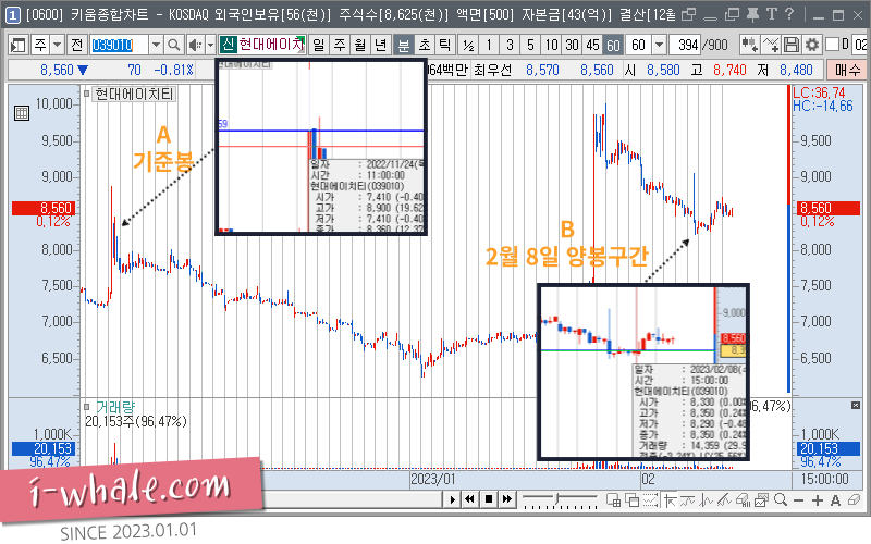 2023년 2월 8일(수)의 주가는 8,350원 부근에서 지지를 받으며 양봉을 만들었음을 확인할 수 있습니다.